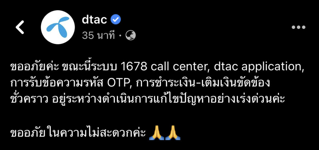 โดยทางด้าน dtac ก็ได้ออกมาโพสต์ข้อความ ขออภัย เนื่องจากระบบการรับข้อความขัดข้อง