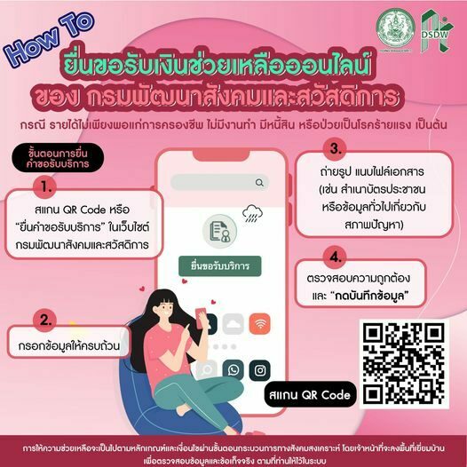 1.สแกน QR Code หรือ “ยื่นคำขอรับบริการ” ในเว็บไซต์ : กรมพัฒนาสังคมและสวัสดิการ
