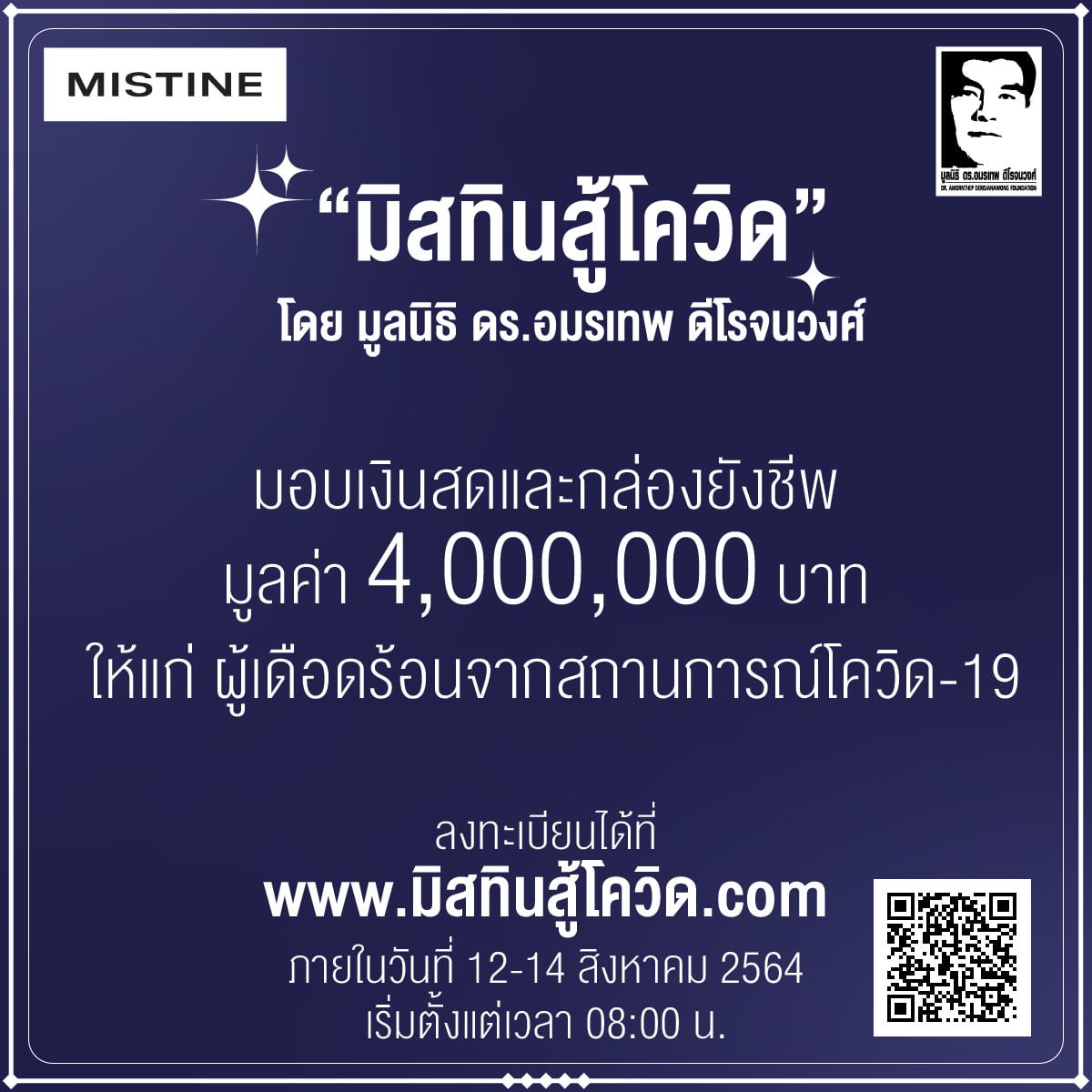 บริษัท เบทเตอร์เวย์ (ประเทศไทย) หรือผู้ผลิตและจัดจำหน่ายผลิตภัณฑ์ภายใต้แบรนด์ “มิสทิน” และมูลนิธิ ดร.อมรเทพ ดีโรจนวงศ์ เปิดเผยเมื่อวันที่ 9 สิงหาคม 2564 ที่ผ่านมาว่า จากวิกฤตโควิด-19 สำหรับใครที่กำลังประสบปัญหาในสถานการณ์ช่วงนี้ ตอนนี้เครื่องสำอางมิสทิน มีทุนและกล่องยังชีพมาแจก สำหรับประชาชนที่ได้รับความเดือดร้อนจากสถานการณ์การแพร่ระบาดของโควิด-19 ในเวลานี้